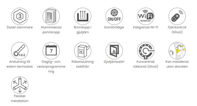 | Typ av kamin | Pelletskamin utan skorsten, Pelletskamin, skorstensfri |
