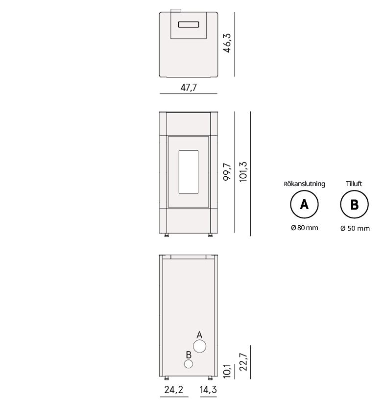 Rökrörsanslutning: Ø 80 mm (bak)